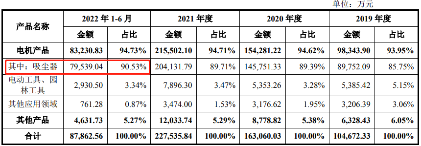 截至2022年6月30日,星德胜吸尘器类电机产品收入高达7.95亿元,占公司收入比例高达90.53%。