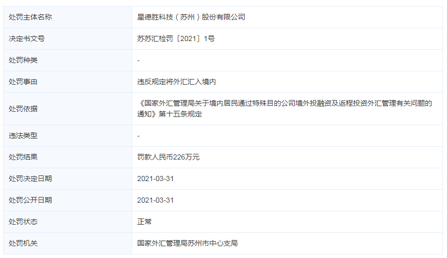 另外,星德胜也被外管苏州支局以公司未能如实披露实际控制人信息的情况下,发生资金流入,处以226万元罚款。