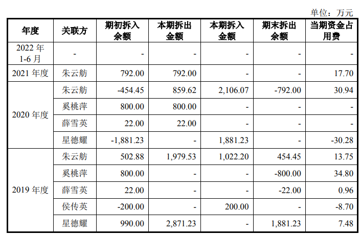 以实控人朱云舫为例,2019年和2020年,星德胜向朱云舫本期拆入金额分别为1022.20万元、2106.07万元。