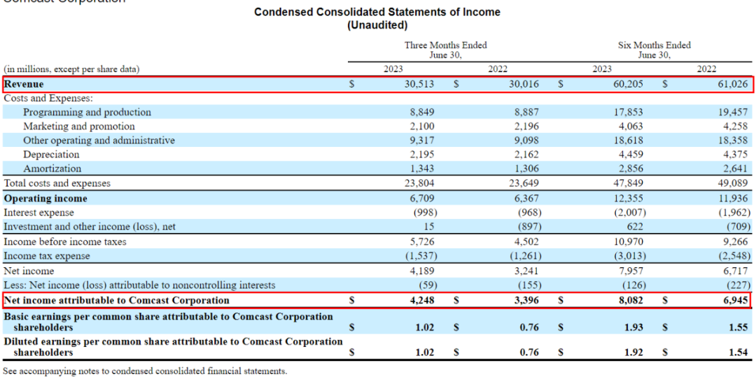 康卡斯特Q2及上半年业绩情况
