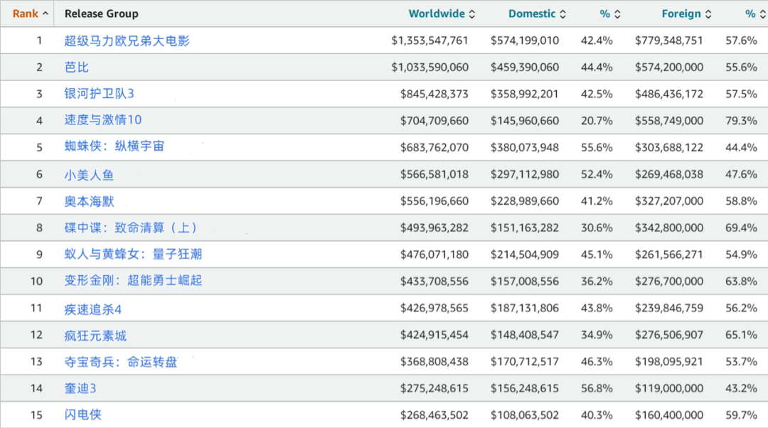 2023年全球电影票房榜(截至8.9,数据来源:Box Office Mojo)