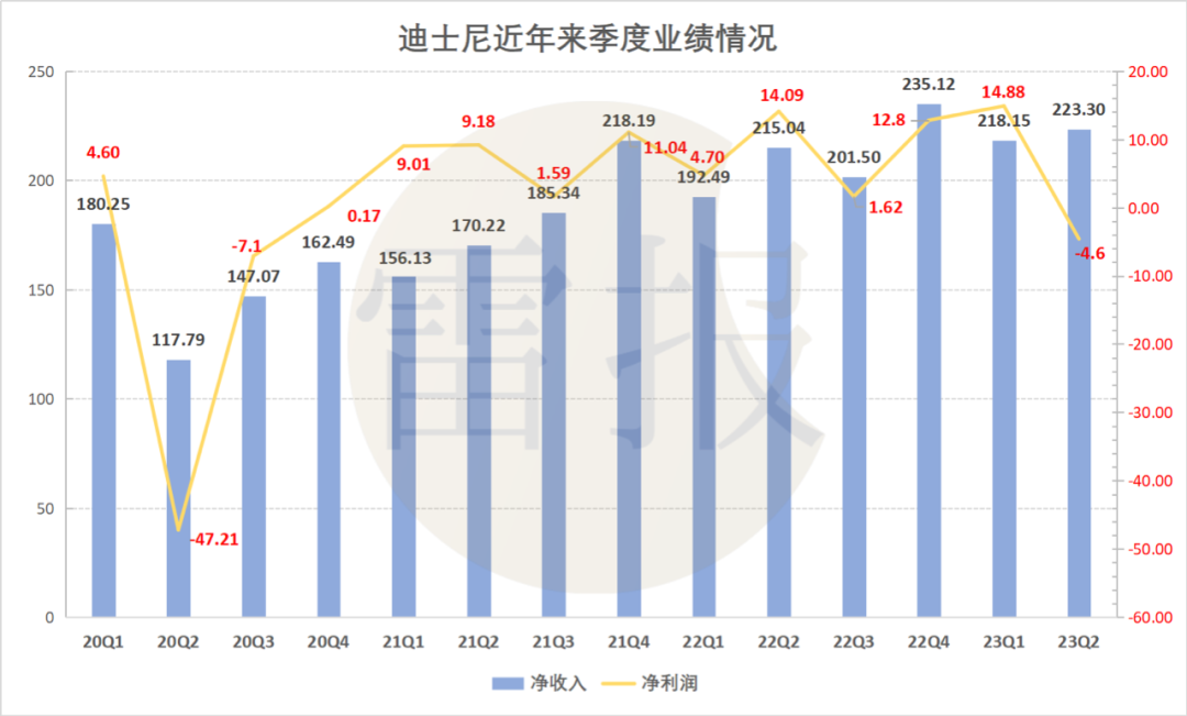 2023年Q2,迪士尼实现营收223.30亿美元(约合人民币1609.98亿元),同比增长4%,不及市场预期;归属于股东净亏损4.6亿美元(约合33.17亿元),去年同期净利润则为14.09亿美元,同比减少132.65%。