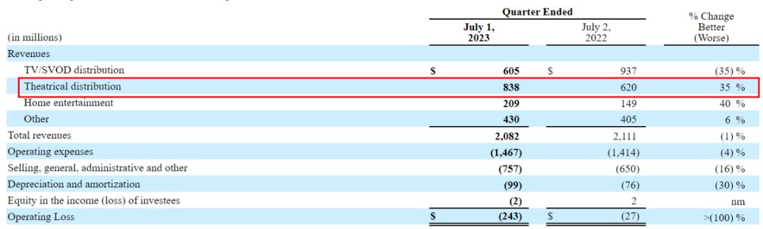 部分电影较为出色的票房推动了二者“院线发行”收入的增加,其中,迪士尼Q2院线发行收入8.38亿美元,同比增长35%,近九个月收入27.45亿美元,同比增长100%,近九个月中表现亮眼的影片还有《阿凡达:水之道》等。