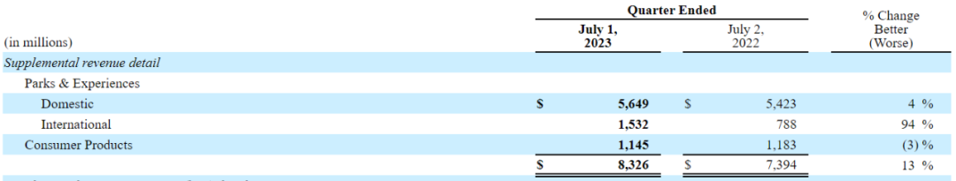 2023年Q2,迪士尼主题乐园与体验相关业务总收入83.26亿美元(约合人民币600.44亿元),同比增长13%,其中,国内的内容与体验方面增长4%,国际的内容与体验方面则实现94%的大幅增长。