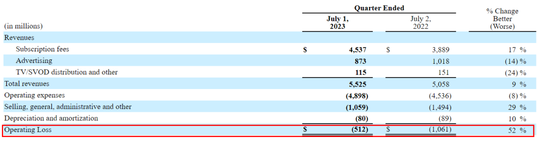 价格上涨之际,迪士尼表示其流媒体业务Q2亏损远低于前几个季度。自2019年底Disney+推出以来,迪士尼在直面消费者(流媒体)业务上损失了超过100亿美元,而最新财报数据显示,2023年Q2,其流媒体业务的营业亏损为5.12亿美元,相比去年同期10.61亿美元,大幅收窄52 %。对此,其首席执行官伊格尔表示了相当乐观的态度,希望在未来几年内大幅提高迪士尼流媒体业务利润率。