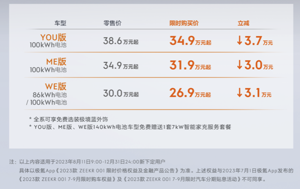 8月11日,极氪汽车推出极氪001最新限时价格权益政策,即日起至年底,新下定用户可享受限时立减3万-3.7万元。
