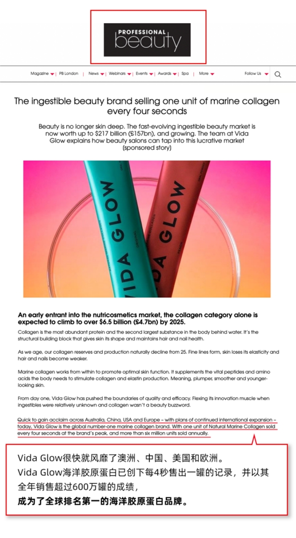 2021年,英国美妆业顶级垂直媒体《Professional Beauty》发布专题报道,认证Vida Glow海洋胶原蛋白肽“凭借创新能力对传统行业标准发起了挑战,以出众的品质和功效超越了消费者的预期”,是当之无愧的“全球排名第一海洋胶原蛋白”。
