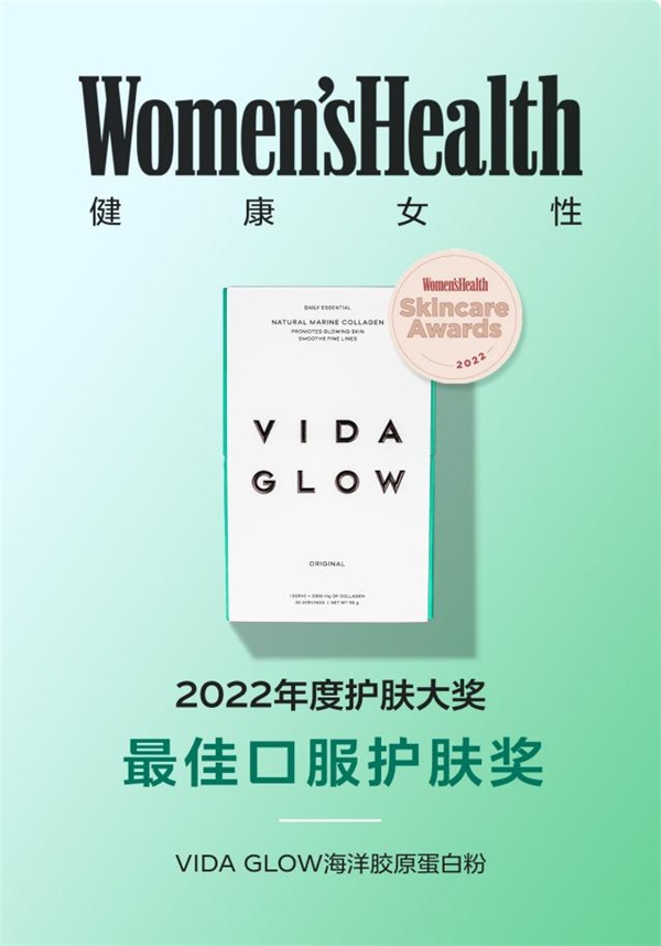 2022年,英国顶尖人气杂志、拥有全球数亿粉丝的《健康女性(Women's Health)》将Vida Glow海洋胶原蛋白肽评选为“2022年最佳口服护肤奖”。该奖项在美容行业被誉为“创新护肤理念的一枝独秀”,代表着全球美容行业的充分认可。