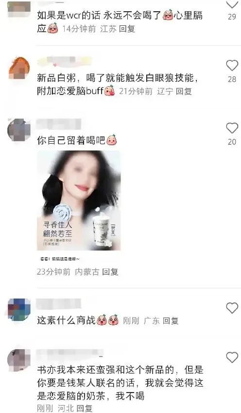 暑期正是奶茶的热销季,不少奶茶品牌试图借助与艺人合作的方式进一步提升新品的关注度。书亦烧仙草官宣新品之时,也以留悬念的方式官宣预热品牌大使,眼尖的网友一眼认出是王楚然,而此时王楚然因在《我的人间烟火》中饰演许沁而路人缘大减、还在网友们的倒油中衍生出了种种负面话题,因此书亦烧仙草此举招到抵制,最终以品牌方撤下相关物料告终。