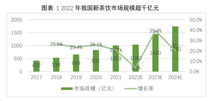 中国连锁经营协会发布的《2022新茶饮研究报告》 显示,2022年新茶饮规模预计达1040亿元,新茶饮门店总数约为48.6万家,2023年,市场规模有望达1450亿元,三年复合增长率近20%。