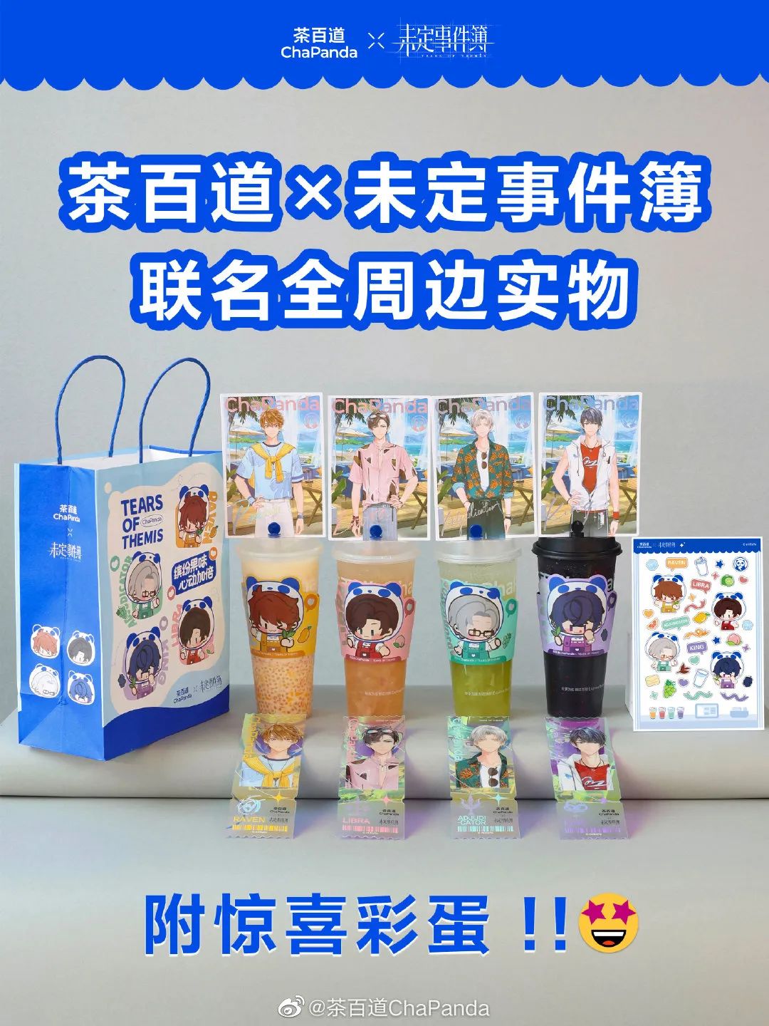 三是与二次元、电竞小众圈层进行联动合作。如果说《乘风破浪》邀请美依礼芽是击破二次元的First blood,那么茶百道与恋爱推理手游《未定事件簿》联名便是典型的Double kill。基于游戏中夏彦、左然、莫弈与陆景和四大角色的主题色,定制推出杨枝甘露、桃子乌龙茶、青提茉莉、乌漆嘛黑4款联名茶饮,并配套联名杯套、纸袋、贴纸、明信片、PVC票根等周边赠品,精准戳中了粉丝心理,不少门店都爆单,为此员工们也感慨:“做不完根本做不完。”