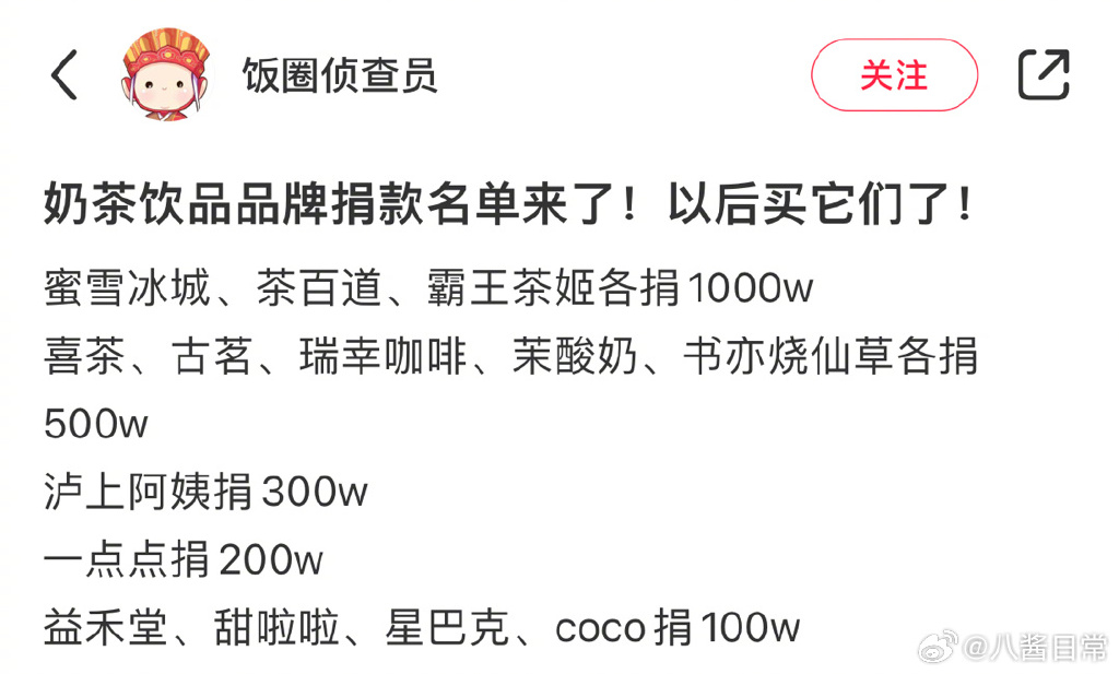 娱乐营销所带来的品牌热度是一时的,公益行动所带来的品牌价值是长久的。近日,受台风影响,多地出现极端强降雨天气,引发洪涝灾害,蜜雪冰城、茶百道、霸王茶姬、喜茶、古茗等品牌捐款驰援防汛救灾,多则千万、少则百万,这样的善举获得了网友们的一致点赞,而蜜雪冰城备注里写的蜜雪冰城与阿桔(代指每一个雪宝)更是感动了不少消费者。为此,还有网友正理解奶茶品牌的捐款名单,并直言要用实际行动去支持这一些有爱心的品牌,一句“以后买它们了”便足以证明心意。