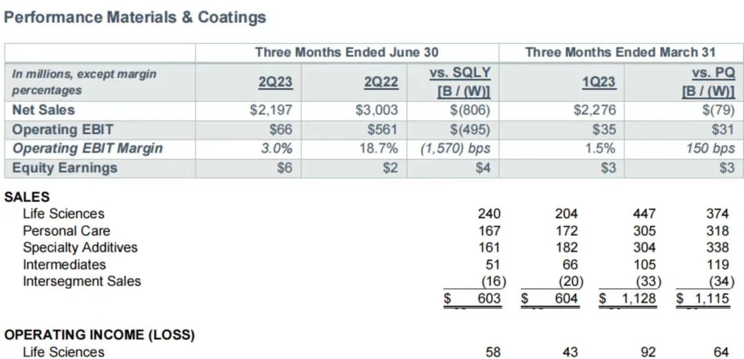 其中,陶氏化学性能材料和涂料部门在2023Q1和Q2净销售额皆下滑,分别为22.76亿美元(约合人民币162.76亿元)、21.97亿美元(约合人民币158.34亿元),跌幅分别为25.35%、26.84%。