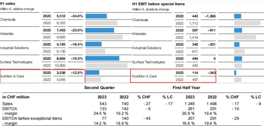 巴斯夫方面表示,营养与护理部门销售额大幅下降与销量下降有关。其中,在Q2该部门销售业绩是由于需求下降、价格下降导致各业务领域销量和销售额、利润率都下降造成的。同时,由于降价主要影响了护理化学品业务中油类表面活性剂和醇类的销售。