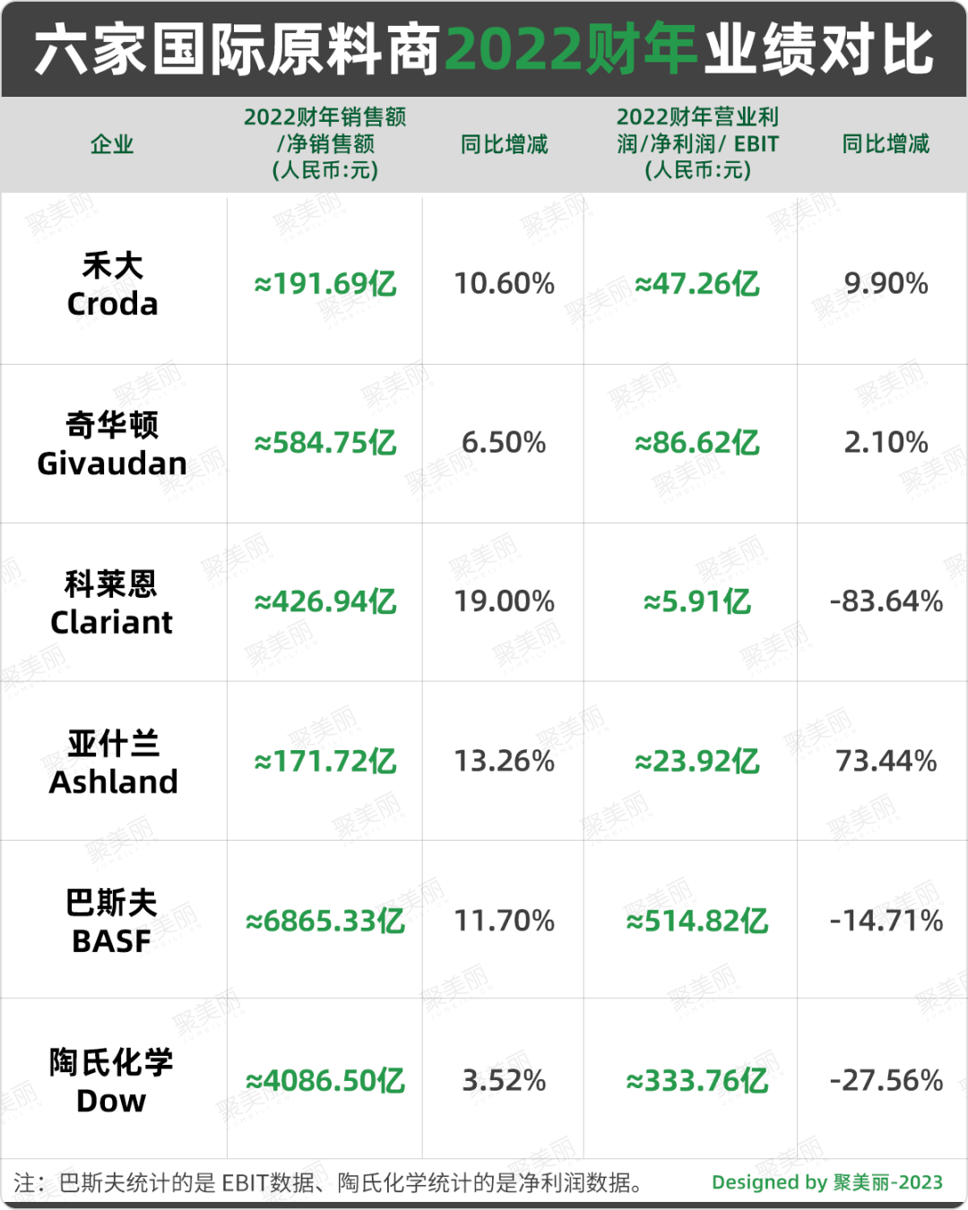 近日,禾大、奇华顿、科莱恩、亚什兰、巴斯夫、陶氏化学这六大日化原料商发布了2023年上半年财报。