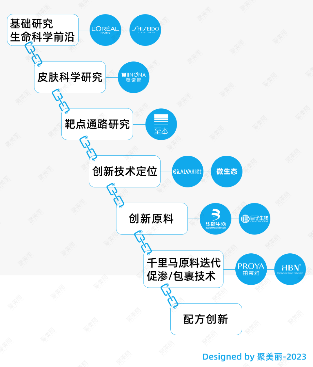 这时候,你需要有一张美妆技术链路地图,如果借用证据链的理念,我们就可以把目前国内知名美妆品牌如何聪明地投研发,列出他们各自侧重的那一段: