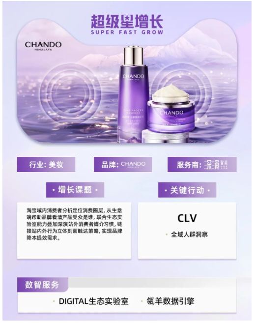 自然堂CHANDO依托自己的品牌优势,以人源于自然的理念,从自然本性和自然之道的角度覆盖和汇聚自然覆盖护肤品、彩妆品、面膜、男士、个人护理等品线,持续升级品牌推广战略,拓展线下线上媒体宣传矩阵,每年的“双十一”大促、“双十二”大促、“女王节”大促、618大促等电商节点,自然堂CHANDO都会通过全域推广,并引导消费者到天猫官方旗舰店加购购买。多年的站外引流策略获得了超过数亿消费者的沉淀,随着品牌可运营消费者存量的提高,对于怎么洞察消费者精准引流有个更高的需求。因此,在本次“618”大促期间,自然堂CHANDO希望通过和深演以及DIGITAL生态实验室,三方共建提高消费者增量价值。