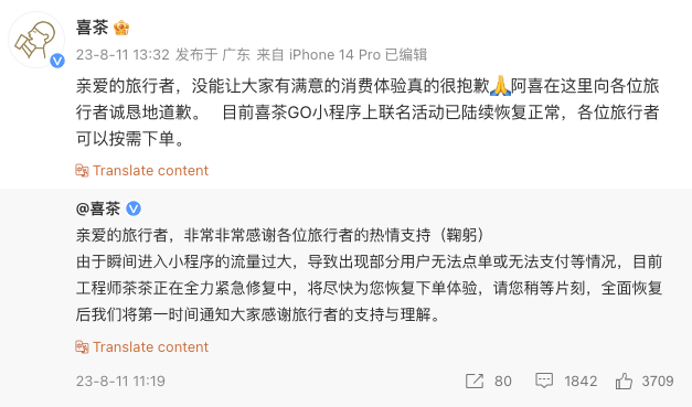 8月11日下午,喜茶官方微博发布更新,就小程序无法点单支付道歉。喜茶表示,目前喜茶GO小程序上联名活动已陆续恢复正常,用户可以按需下单。今日上午,喜茶与原神联名活动开启,联名饮品在喜茶GO小程序上架。上架后不久,多个用户反映无法点单或无法支付。随后,喜茶方面发公告解释,系由于瞬间进入小程序的流量过大,导致出现部分用户无法点单或无法支付等情况。