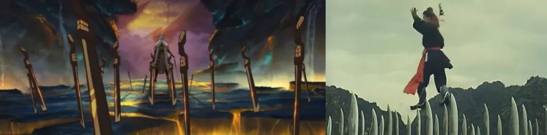 据导演自述,在寻找参考画风时,他被王希孟《千里江山图》中的矿物颜彩所吸引,于是和团队决定采用撞色与选色。张大千的《泼墨图》以及傅抱石的“散锋笔法”也都是他们学习的对象。