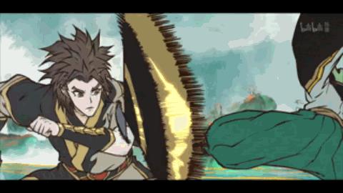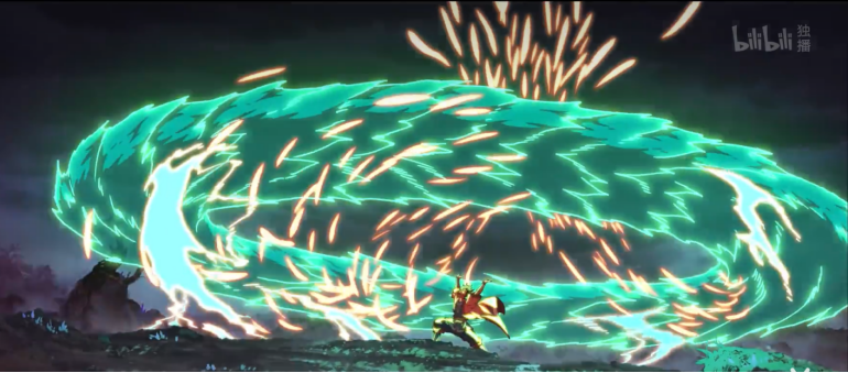 而五行使者和妖兽的打戏重在“写意”,相对夸张化,充满想象力。以《雾山五行之犀川幻紫林篇》第二集闻人翊悬和妖兽角尾的打斗为例,镜悬使出炎环轰,整个人笼罩在绿色的光环之中,并有金色火花不断闪烁,场景不可谓不壮观。