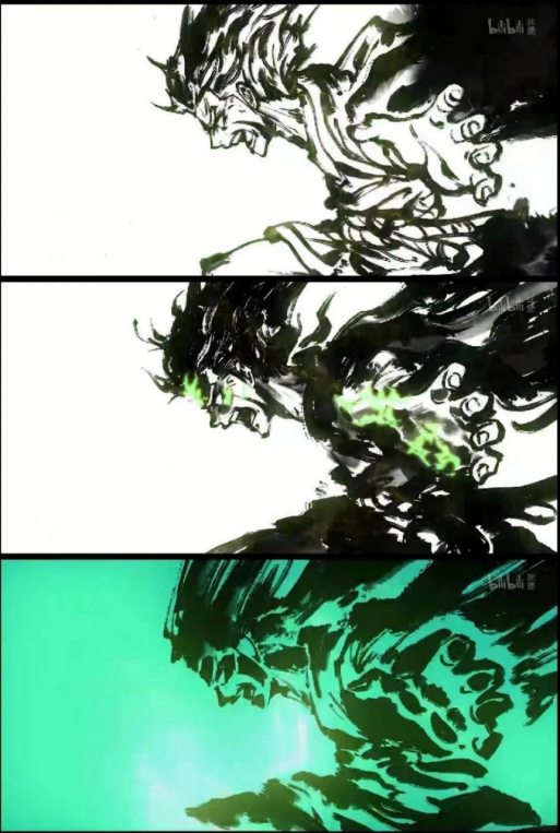 在战斗的高潮段落,《雾山五行》常会穿插几个黑白水墨原稿的镜头,画面从彩色切换成黑白色,人形抽离成简单的线条,产生强大的视觉冲击,以此表现主角碾压对手的超强战斗力。