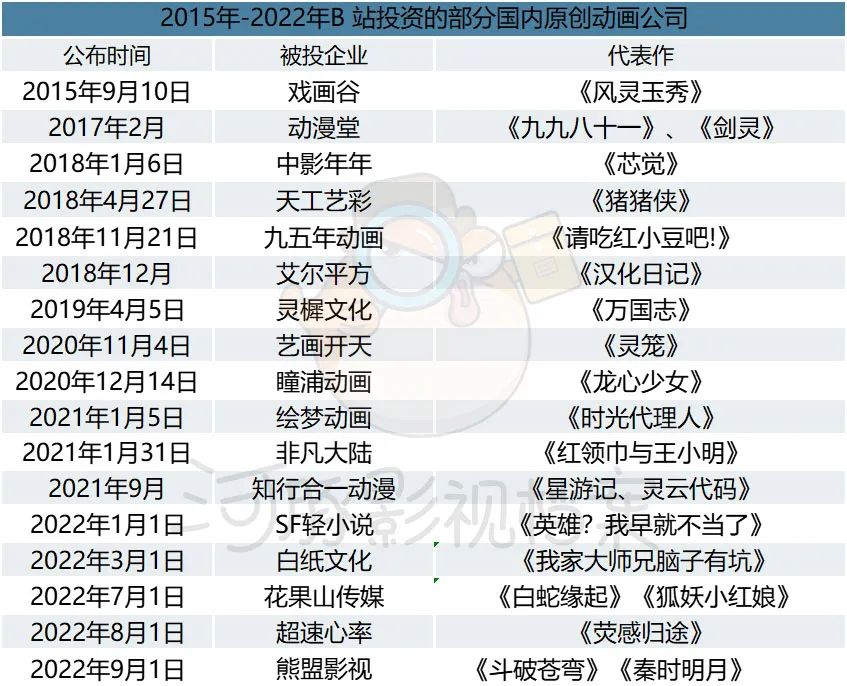 此外,B站还直接投资了多家原创动画公司。据统计,自2015年以来,B站投资了数十家原创动画公司、《灵笼》的制作方艺画开天、《请吃红小豆吧!》的制作方九五年动画等等。