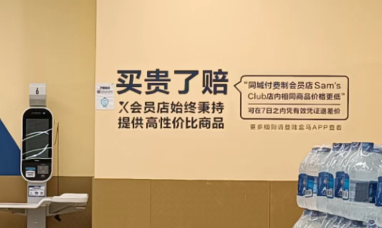 在北京目前唯一一家线下盒马X会员店中,每走几步就是写着一墙赤裸裸的标语,“同城付费制会员店Sam's Club店内相同商品价格更低”。
