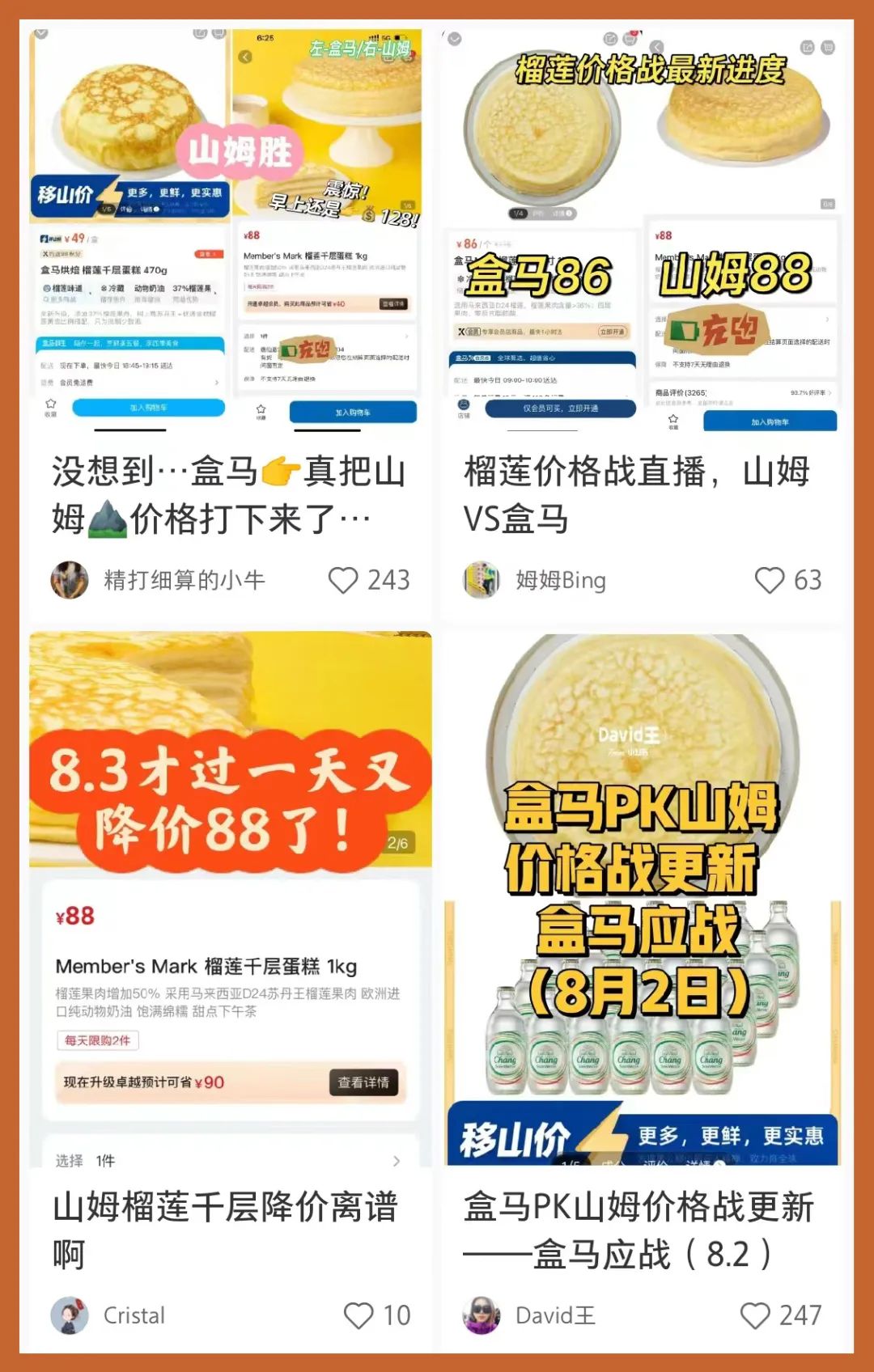 山姆大叔继续不服输,最近这段时间又把榴莲千层的价格,打到了88元,后又打到了85元,原因是盒马把价格又从89元打到了86元。