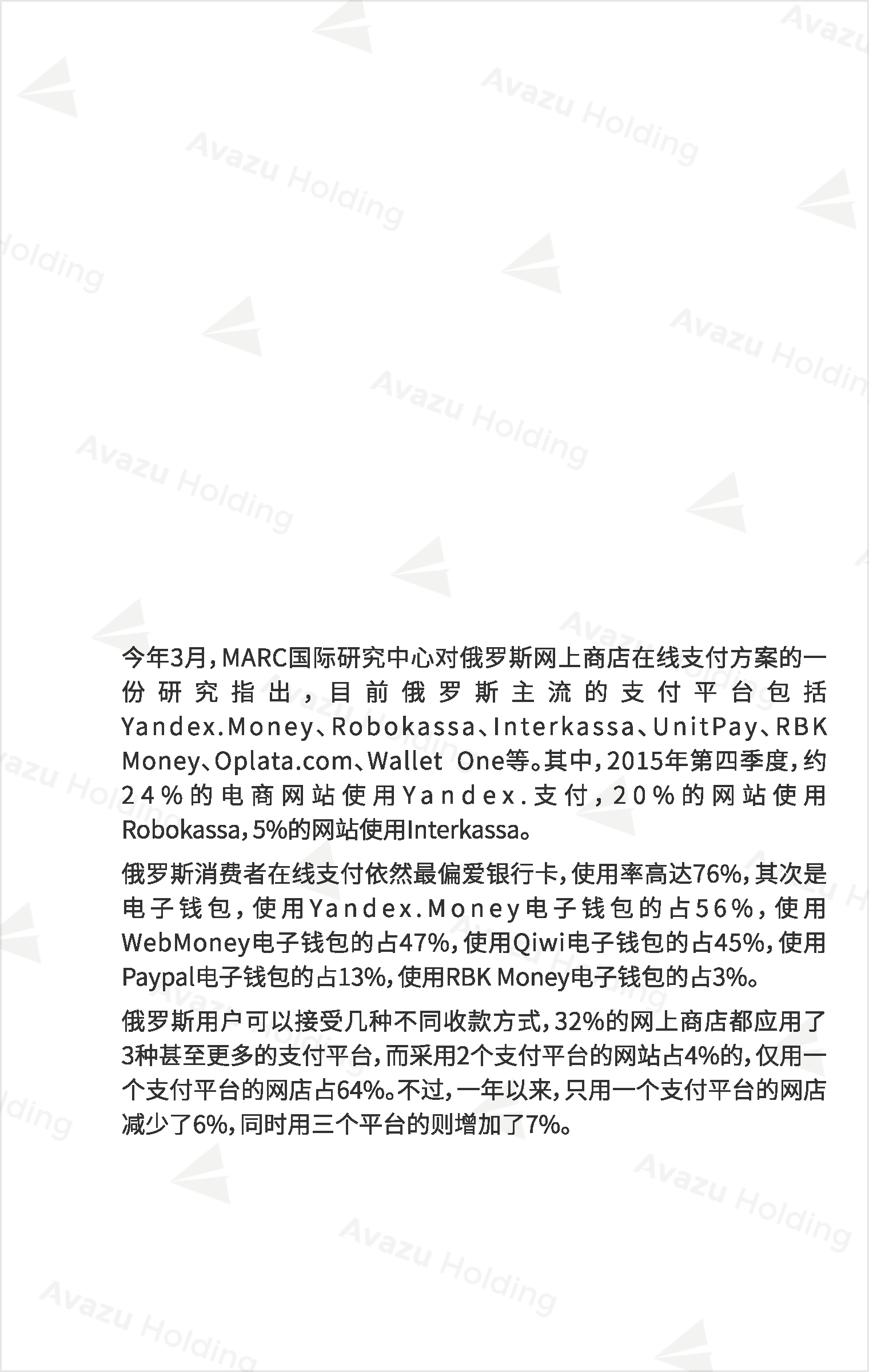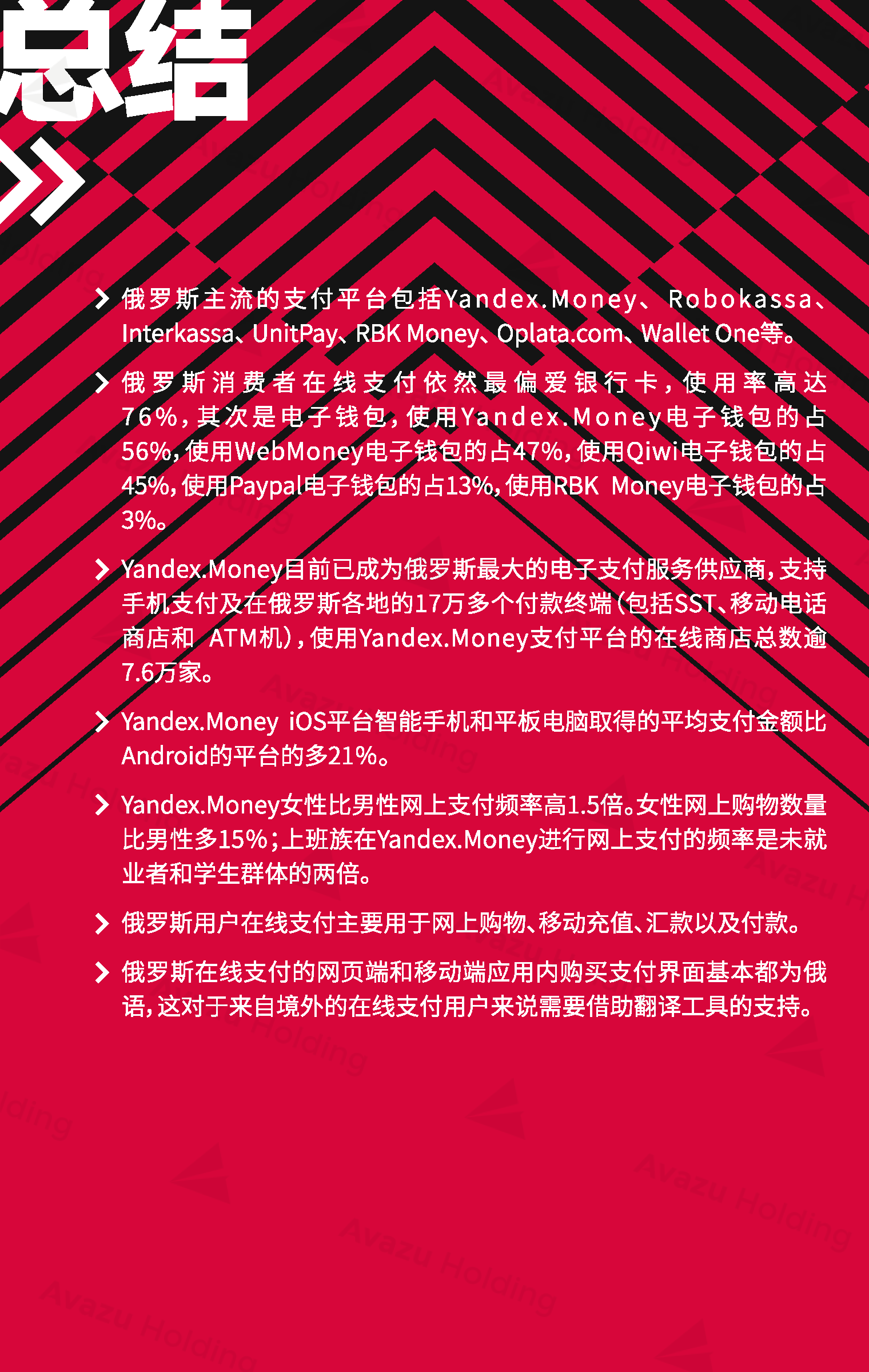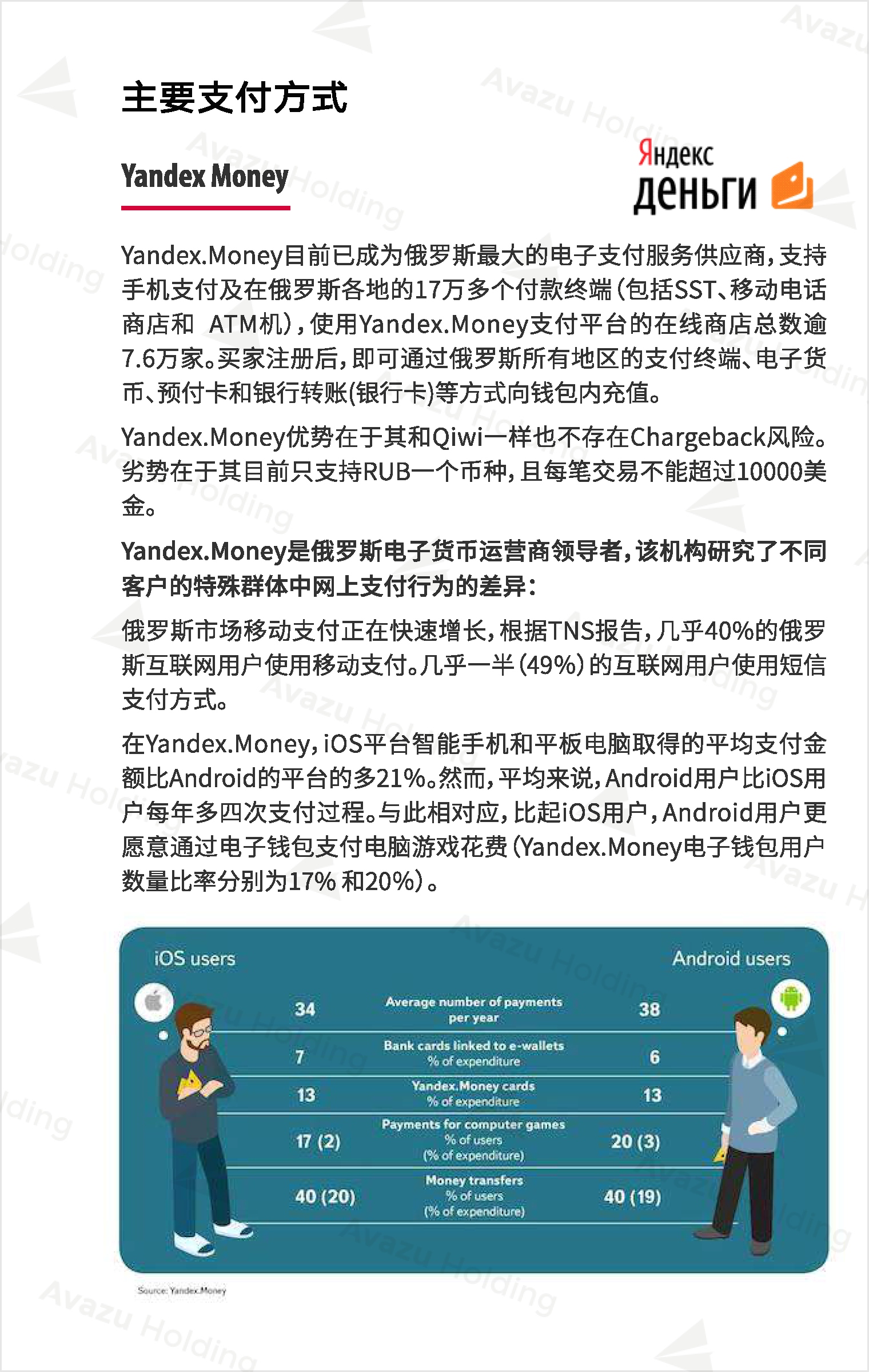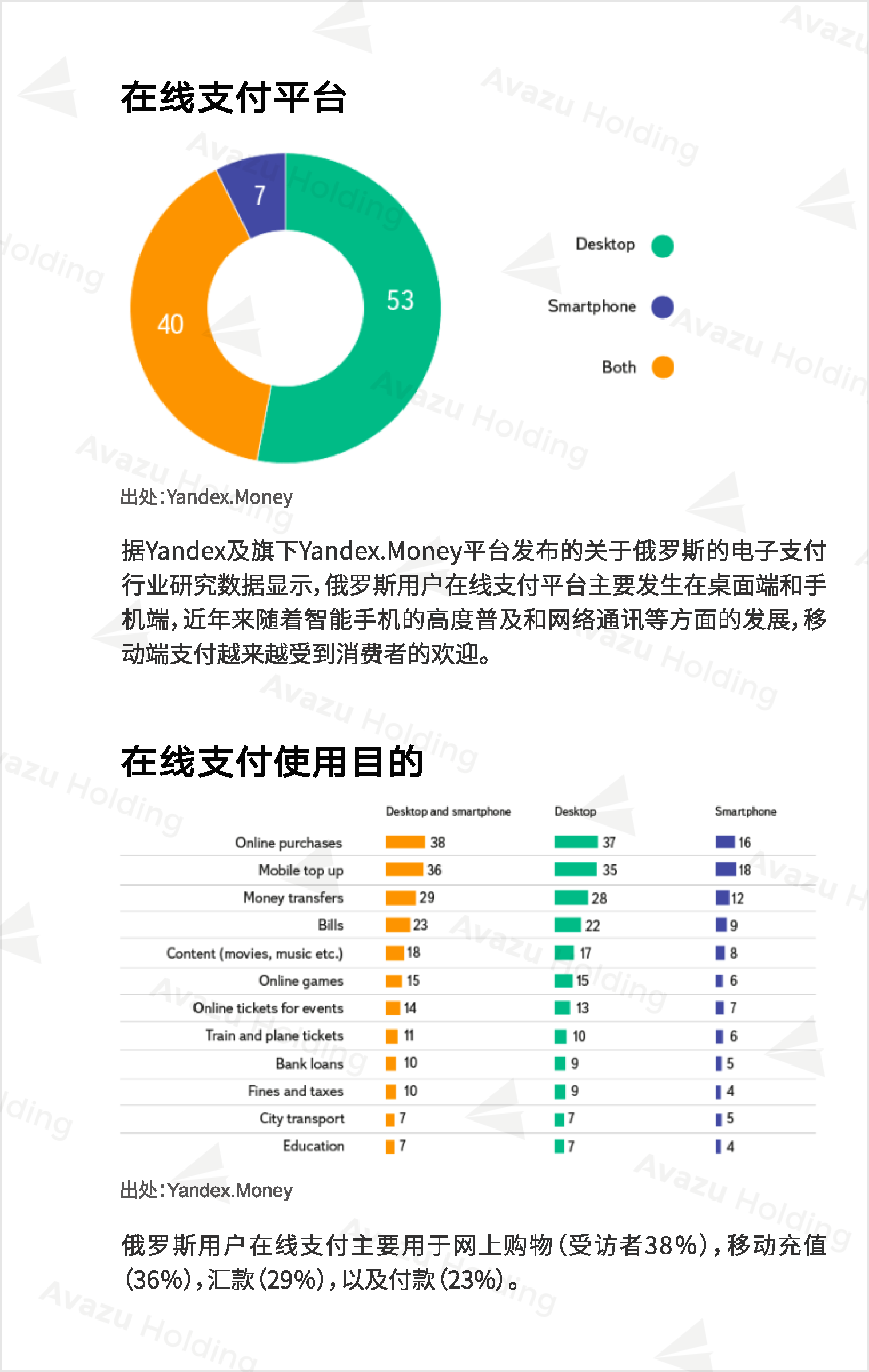 俄罗斯用户在线支付主要用于网上购物、移动充值、汇款以及付款。