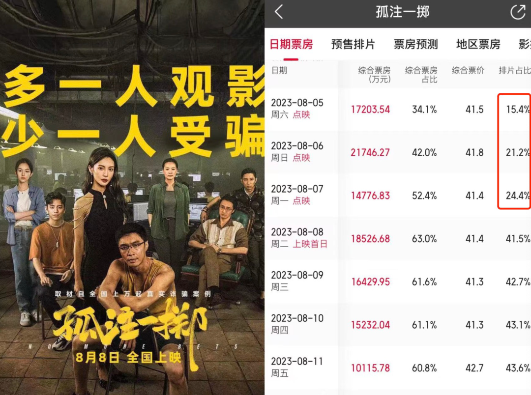 为了不像《八角笼中》一样有争议,《孤注一掷》稍微收敛了一点。选择提前一周,从8月5日起,每天14-21点进行全国点映,相当于只是排除了早场和夜场。但谁都知道,这些场次本身也不卖座,算不算进来也没什么影响。