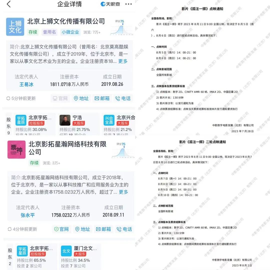 宁浩带着他扶持的另一位新导演申奥的作品《孤注一掷》来了。电影的发行方上狮文化也是宁浩入股的公司,其实也和当年操盘《我不是药神》发行的北京文化有渊源。上狮的大股东北京宇拓星辰老板张永平,与北京文化合伙了影拓星瀚网络科技公司。而影拓星瀚所做的票神票务平台,曾经是北文寄希望于抗衡猫眼的业务。