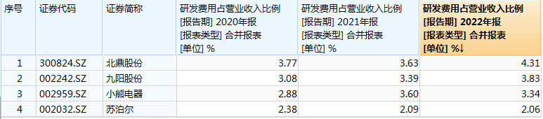 从上图可以看到,2022年同行可比上市公司北鼎股份、九阳股份(002242.SZ)和小熊电器的研发费用率分别为4.31%、3.83%、3.34%,均超过苏泊尔的2.06%,且近三年的研发费用率一直处于垫底状态。
