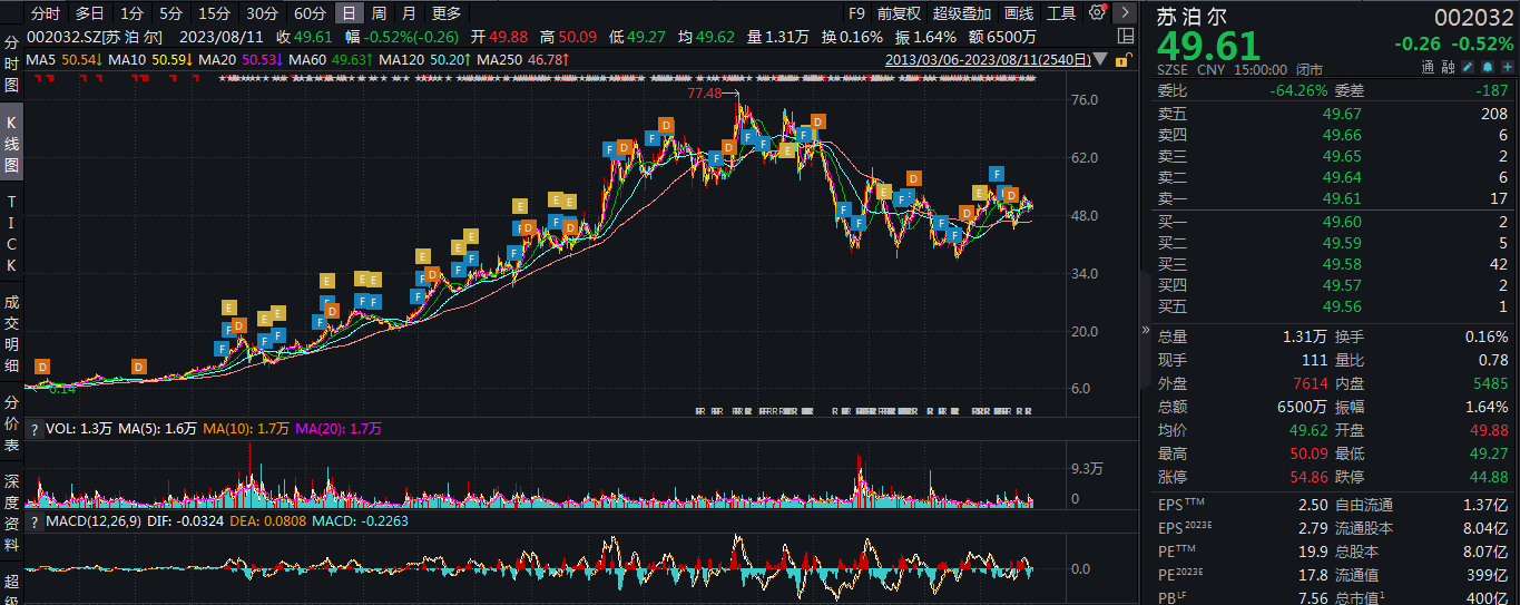 据业绩快报显示,2023年1—6月,苏泊尔实现营业收入99.83亿元,同比下降3.31%;归母净利润为8.81亿元,同比下降5.6%。