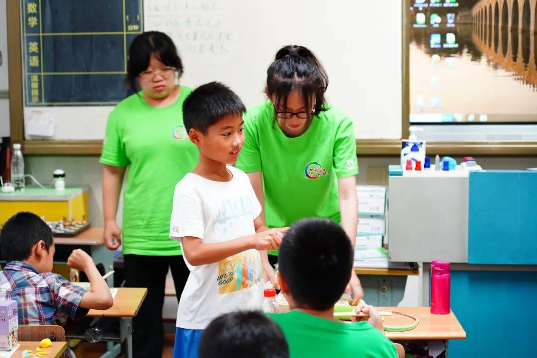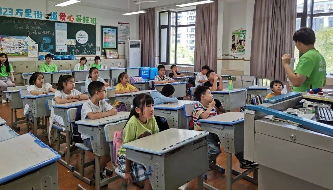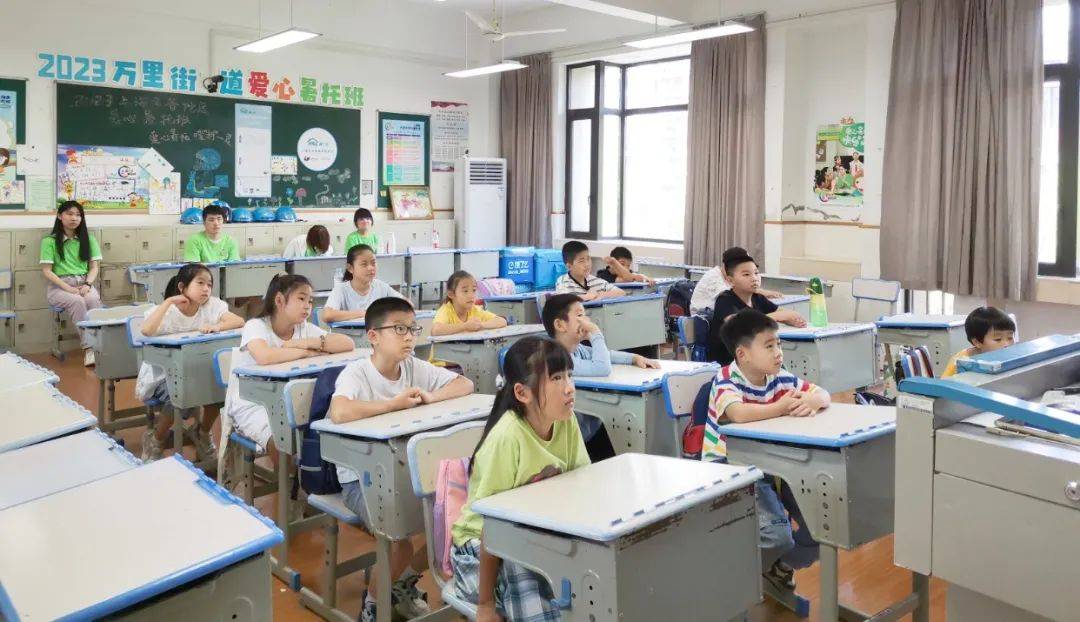 2023年爱心暑托班顺利开展的背后,是各方服务力量的合力保障。今年暑托班形成了“1+2+8”的管理队伍体系,“1”是街镇团组织负责人担任指挥员,“2”是办班点所在学校分管校长担任巡视员、在校教师担任班主任,“8”是配备8名大学生、高中生志愿者和晨检志愿者,全力做好班级管理和服务。走进暑托班的课间,许多志愿者们和孩子们打成一片,一名高中生志愿者谈道,“我们来做志愿者经历了培训,教我们要做些什么、怎么和孩子们相处等,除了在上课时陪伴与监督,我们还会为他们辅导和检查作业,孩子们有问题都会来问我们,我们也会积极解答。”