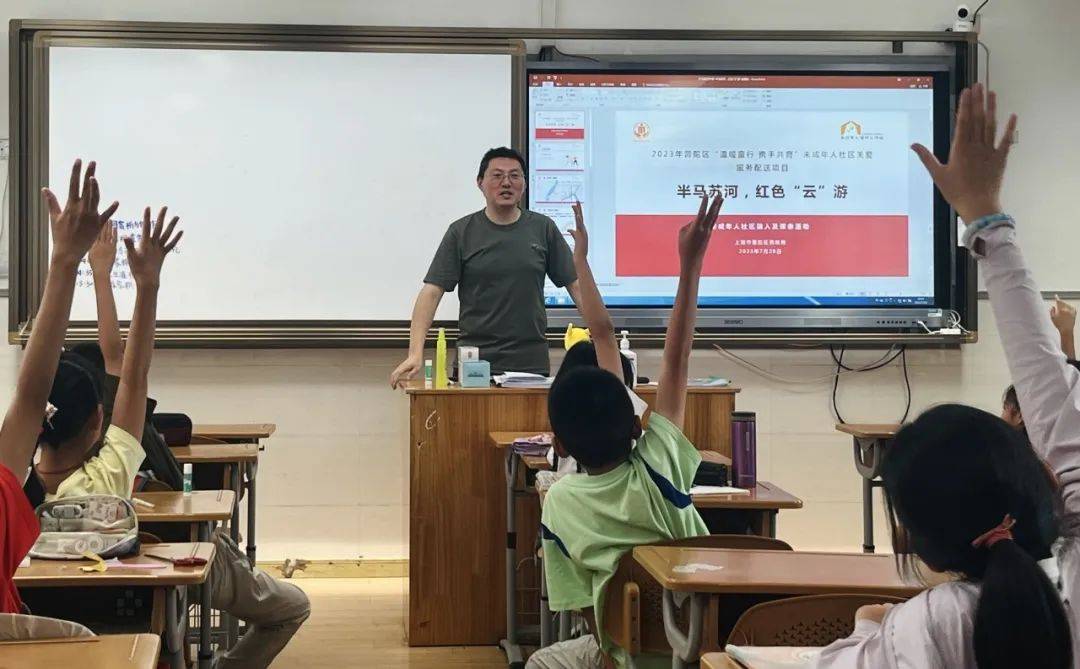 此外,今年暑托班首次由上海市青少年创新学院普陀分院、各街镇创新实验室提供科普创新内容,融入半马苏河·彩虹学园活动,让孩子们充分感受 “中华武数”和“半马苏河”的建设成果。其中,长征镇小学生爱心暑托班邀请普陀区普老“四史”宣讲团副团长、普陀区关爱团副团长、长征镇机关退休第一党支部书记袁芳荣授课,用简单生动的语言为学生们讲述半马苏河的红色历史故事。