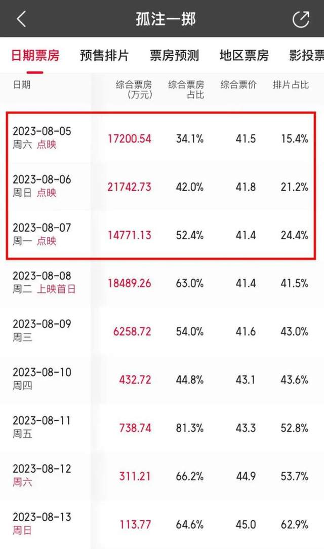 猫眼专业版数据显示,8月5-7日,《孤注一掷》排片占比分别为15.4%、21.2%和24.4%。截至2023年8月7日11时41分,《孤注一掷》点映票房达4.201亿元,刷新中国影视点映票房纪录。