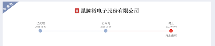 2023年7月24日,昆腾微向深交所提交了《昆腾微电子股份有限公司关于撤回首次公开发行股票并在创业板上市申请文件的申请》,关于终止对昆腾微IPO的最终决定于8月4日才下达。