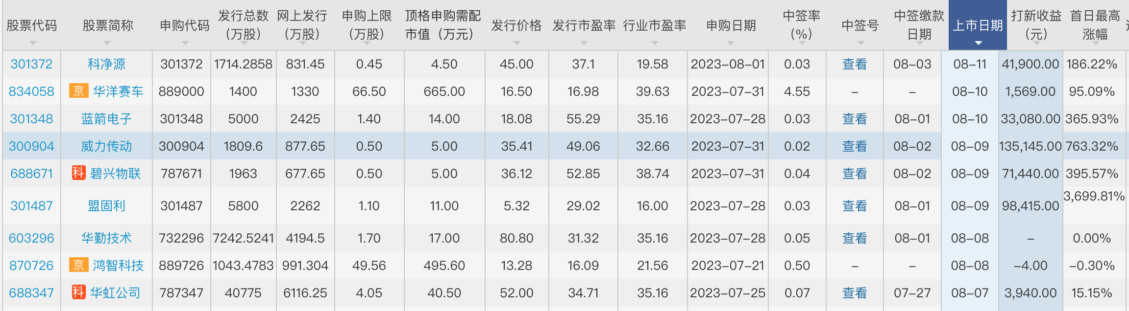上周,新股“大肉签”频出。上市首日,盟固利(301487.SZ)最高涨了3699.81%,威力传动(300904.SZ)最大涨幅763.32%,碧兴物联(688671.SH)395.57%,蓝箭电子(301348.SZ)365.93%;收益方面,威力传动首日最高达到13.51万元,盟固利有9.84万元,碧兴物联7.14万元,科净源(301372.SZ)4.19万元,蓝箭电子为3.31万元。