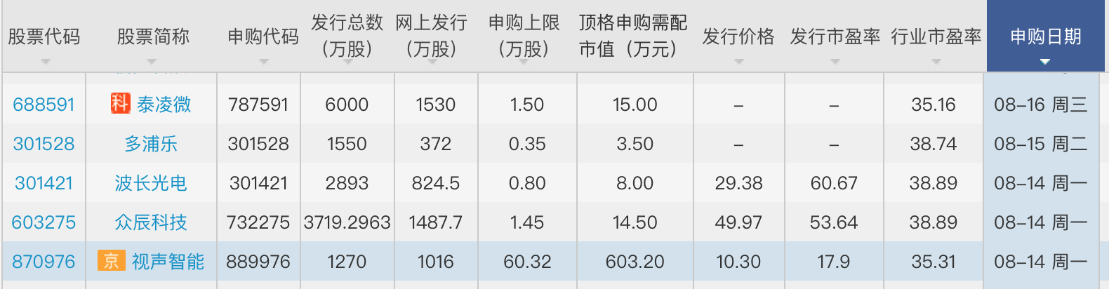 到了8月16日,还有一只科创板新股泰凌微(688591.SH)可申购,该股的申购上限为1.5万股,顶格申购需配市值15万元。泰凌微主营无线物联网系统级芯片的研发、设计及销售。据披露,泰凌微无线芯片市场细分低功耗蓝牙芯片领域全球市占率前三。泰凌微2023年上半年的营业收入和净利润数据分别为3.19亿元和2861.32万元。