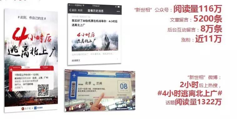 今年夏天刷屏的“逃离北上广”,也是是抓住了北上广白领的一个小情绪说事,北上广生活压力都很大,各种苦逼和快节奏,但是上海也充满诱惑。很多人在这种矛盾的心态下挣扎。去年那份牛逼的辞职信:世界那么大,我要去看看,引起了全国性的讨论。于是在这两种情绪裹挟下的短暂逃离北上广策划,瞬间引爆了朋友圈。微信单篇推文的阅读量116万,留言5200条。随后各种讨论和延展传播,成就了今年的一个现象级案例,也让新世相从一个公众号转身为一个具有强烈策划能力的媒体和广告公司。