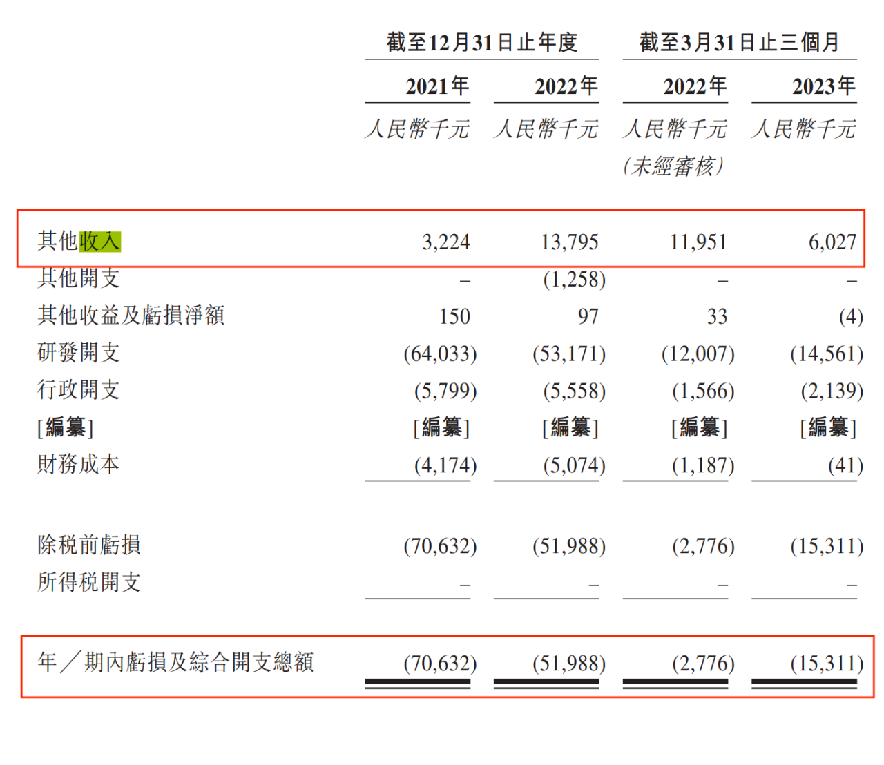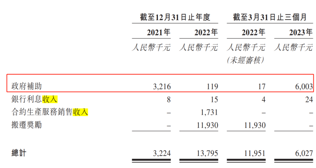 招股书显示,2021-2023年3月,其他收入为322.4万元、1379.5万元、602.7万元。其中,来自政府补助的收入为321.6万元、11.9万元、600.3万元,占比总收入的99.8%、0.9%、99.6%。