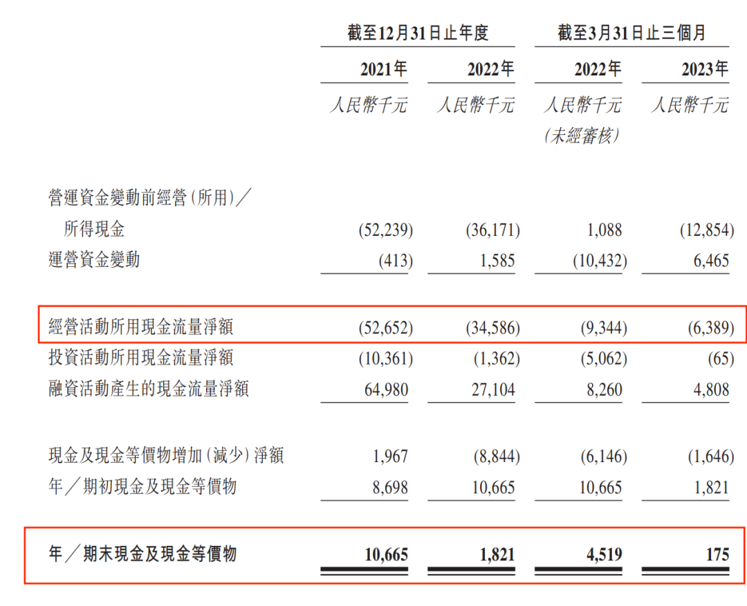 招股书显示,2021-2023年3月,企业的经营活动现金流净额长期为负,分别为-5265.2万元、-3458.6万元、-638.9万元。
