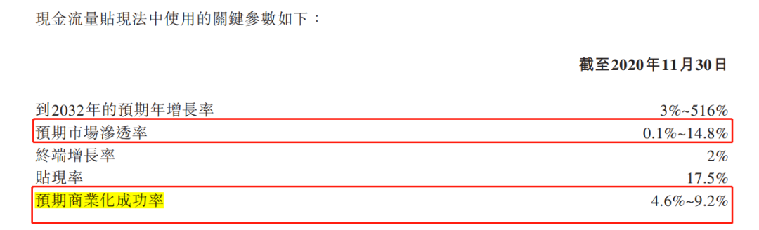 在衡量股权公平值时运用了一些关键数据,这些数据描摹了盛禾生物未来的轮廓:截至2020年11月30日时,企业预期到2032年的年增长率在3%-516%之间,预期市场渗透率0.1%-14.8%,预期商业化成功率只有4.6%-9.2%。