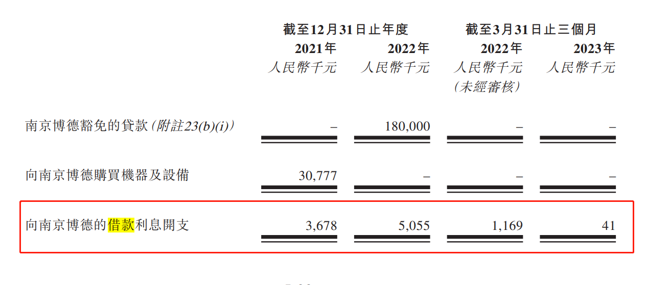 此外,南京博德向盛禾生物提供借款,每年可以获得高额利息。2021-2023年3月,向南京博德的借款利息开支分别为367.8万元、505.5万元、4.1万元。