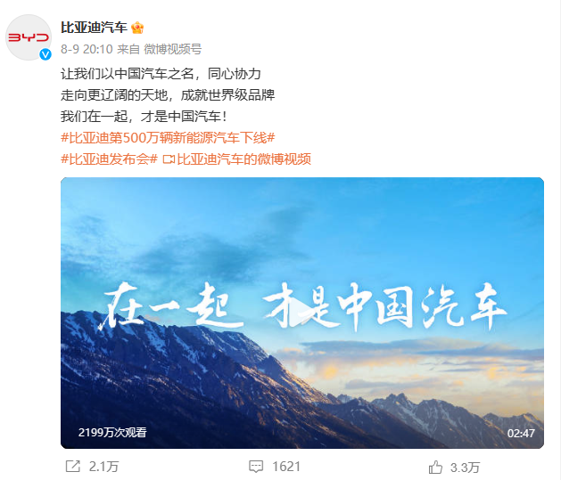 当日晚间,一条主题为“在一起 才是中国汽车”,回顾中国汽车产业发展历程的官方宣传视频,引爆朋友圈和社交网络。比如视频号点赞10万+,转发10万+,推荐10万+,评论也有1.6万余条;该条视频在微博转发2.5万余次,播放量超过2200万。在这个比亚迪汽车甚至中国新能源汽车具有里程碑意义的时刻,比亚迪的一系列操作,把调子起得高高的。