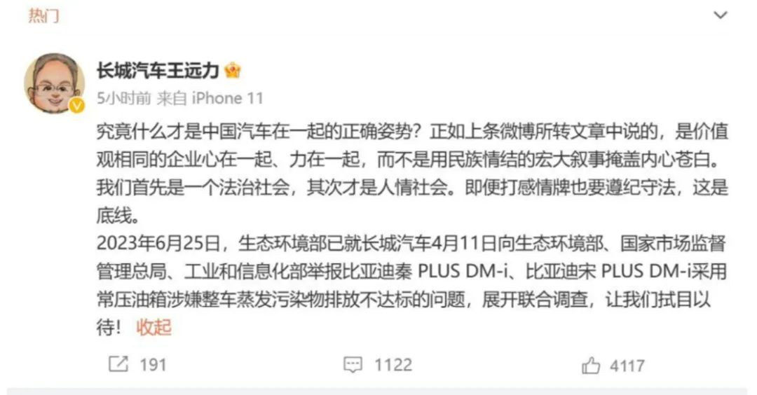 当晚王远力再次发布动态称,中国汽车在一起“不是用民族情结的宏大叙事掩盖内心苍白”,并把“比亚迪油箱问题”带回公众视野,称生态环境部已就长城汽车对比亚迪的举报问题,展开联合调查。