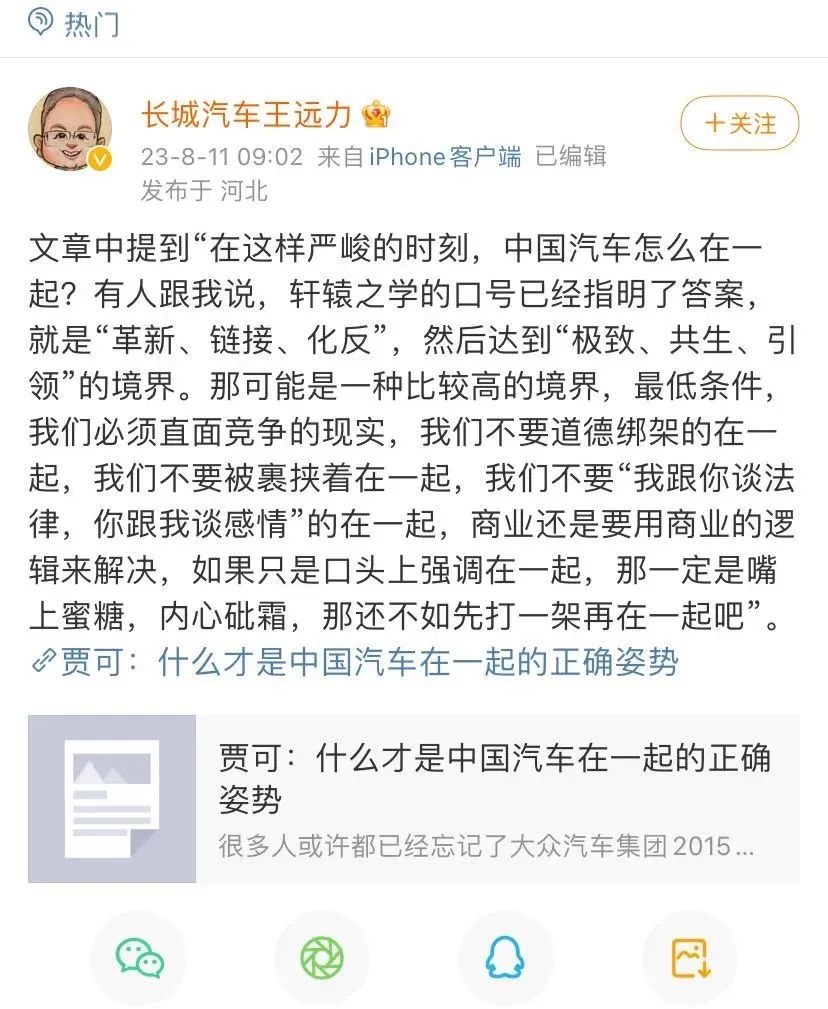 8月11日,长城汽车CTO王远力在社交媒体转发一篇媒体人文章,并直接引用文中观点:“我们必须直面竞争的现实,我们不要道德绑架的在一起,我们不要被裹挟着在一起,商业还是要用商业的逻辑来解决,如果只是口头上强调在一起,那一定是嘴上蜜糖,内心砒霜,那还不如先打一架再在一起吧。”