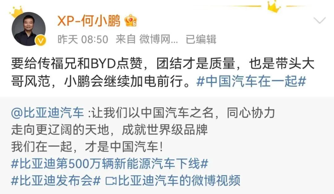 虽然,小鹏汽车董事长何小鹏回应称,要给传福兄和BYD点赞,团结才是质量,也是带头大哥风范,小鹏会继续加电前行。比亚迪可能也想当新能源汽车的带头大哥,但又没完全说。