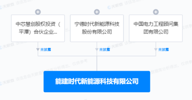 天眼查显示,近日,能建时代新能源科技有限公司成立,法定代表人为周毅,注册资本6亿元,经营范围包含:储能技术服务;智能基础制造装备制造;合同能源管理等。股权穿透显示,该公司由宁德时代、中国能建全资子公司中国电力工程顾问集团有限公司、中芯慧创股权投资(平潭)合伙企业(有限合伙)共同持股。