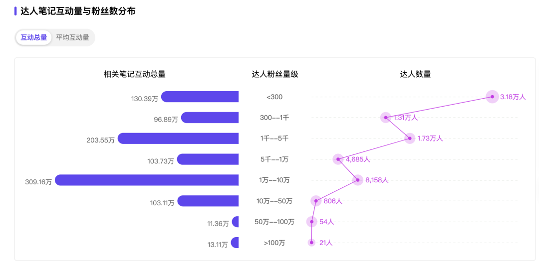 与此相对的是平台的达人数量。千瓜数据显示,截止目前,小红书露营相关达人总数量在 7.5 万左右,1 万粉以下的露营达人占比 52.4%(包含 41.9%,粉丝 300 以下的素人),1 万-10 万粉占比 10.7%,10 万粉以上占比 1.16%,不到 900 人。百万粉博主虽然平均互动量最高,但互动总量大部分是 10 万粉以下达人贡献。